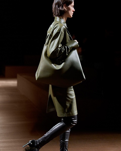 La ligne prêt-à-porter de Ferragamo se distingue par des textures audacieuses et des couleurs chaudes. Chaque pièce est soigneusement conçue, et jusqu'aux sacs, tout reflète cette volonté d'élégance. Le savoir-faire artisanal reste au cœur de la maison, illustré par la nouvelle pièce maîtresse : le Hug Bag. Ses variations à l'élégance unique, dont une qui se recouvre de 950 sequins en cuir laqué, nécessitent plus de 19 heures d’un travail artisanal méticuleux pour créer un effet d'écailles de sirène.